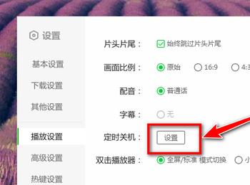 4.第四步,我们可以看到如下图所示的播放设置页面,点击定时关机右边箭头所指的设置选项。