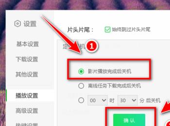 5.第五步,来到下图所示的设置页面后,点击影片播放完后关机左边的选项框,接着点击箭头所指的确定选项。