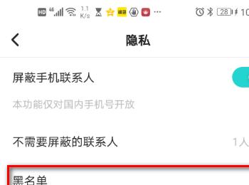 5.第五步,来到下图所示的隐私页面后,点击箭头所指的黑名单选项。