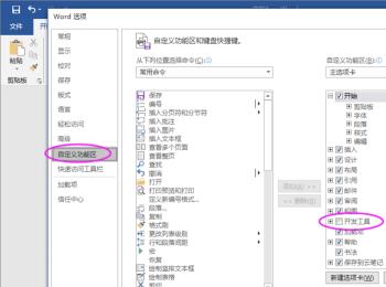 3. 第三步打开【Word选项】窗口后,先点击【自定义功能区】,接着根据下图箭头所指,找到并勾选【开发工具】。