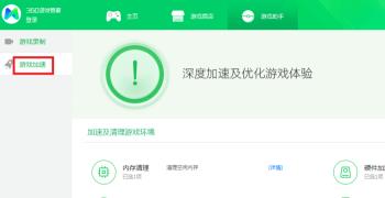6. 如图,在打开的页面,点击左侧的“游戏加速”选项,最后点击右上角的“立即优化”按钮,等待优化完成即可解决。