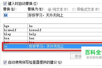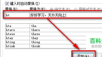 比如说我们要用“ht”来代替“好好学习,天天向上”这个短语。那么在【替换】的位置输入“ht”,在【替换为】中输入“好好学习,天天向上”。
