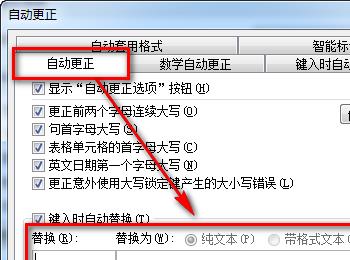 默认显示的是【自动更正选项卡】,可以自定义自动更正的内容。