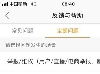 4. 第四步,跳转至反馈与帮助功能页面后,先点击上方的全部问题标签,在全部问题列表中,点击直播选项。
