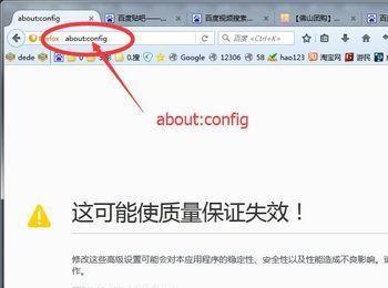 1、打开火狐浏览器,在地址栏输入:about:config,进入高级设置界面