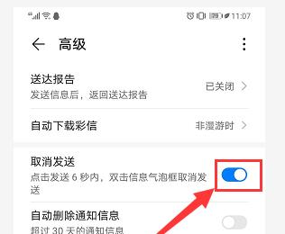 5. 如图,在打开的高级页面,将取消发送右侧的开关打开,这样我们在发送信息6秒内,就可以操作撤回了。