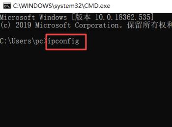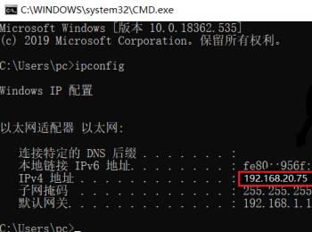 4. 在打开的窗口中,输入【ipconfig】命令后,回车,确认显示的IP地址,记一下该地址。