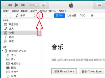 2.第二步,来到下图所示的itunes软件主页面后,点击页面顶部箭头所指的手机图标。