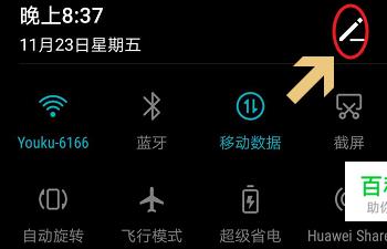 通知栏最上方会有一些常用功能列表,比如说WiFi、蓝牙等,再次往下拖动可以打开折叠的其他功能,如果其中没有找到屏幕录制,那么就点击右上角的铅笔图标;