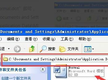 2. 然后按照下面的路径进入:“C:\Documents and Settings\Administrator\Application Data\Microsoft\Templates”找到公用模板文件“Normal.dot”,删除即可。