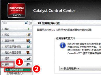 在AMD显卡控制面板界面,首先点击右上角“首选项”,选择“高级视图”高级视图,这下清楚多了,点击游戏,然后再点击应用程序设置,设置的项目包括: