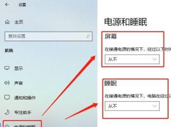 3. 在打开的系统设置页面,左侧点击【电源和睡眠】选项,然后在右侧打开的页面,将屏幕关闭时间和睡眠时间全部设置为【从不】,如图。