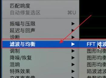 4.第四步,我们可以看到如下图所示的页面,点击页面顶部的效果选项,接着点击箭头所指的滤波与均衡选项,然后点击弹出窗口中的FFT滤波器选项。
