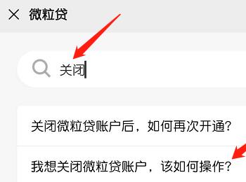 4.第四步,我们可以看到如下图所示的帮助中心页面,点击右上角箭头所指的搜索图标,接着输入关闭,然后点击我想关闭微粒贷账户的选项。