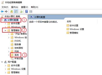 2. 在打开的本地组策略窗口中,左侧依次点击【计算机配置】—【管理模板】—【系统】选项。