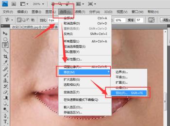 4. 我们先对创建的选区进行羽化,可以让填充的颜色更加自然。依次点击上方的“选择”—“修改”—“羽化“选项。