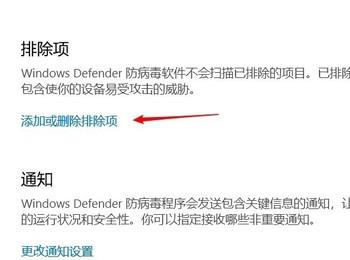 6. 第六步,在病毒和威胁防护设置页面中,向下滑动页面, 点击箭头所指的添加或删除项选项。