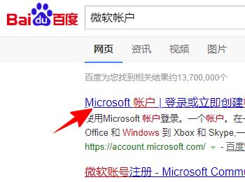 1. 首先打开电脑上的浏览器,进入百度页面,输入“微软帐户”,点击官网链接。