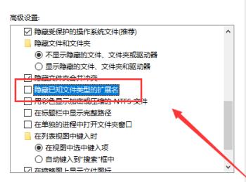 6. 然后在高级设置列表中,找到“隐藏已知文件类型的扩展名”的选项,取消前面的勾选