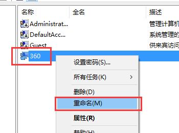 4. 然后在打开的页面,找到想要修改的用户名,右键,在打开的菜单中,选择“重命名”选项。