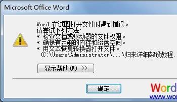 今天群里有个朋友说刚下载了个Word文件是“.DOCX”格式的,自己电脑上是Office2003版本,打不开,所以让我帮他转换一下。大家都应该知道“.DOCX”格式只有Word2007或以上版本才可以打开,Word2003是无法打开的!正好我电脑上03和07都有,所以就答应了。接收文件打开后既然提示“Word在试图打开文件时遇到错误。请尝试下列方法”(如下图)。