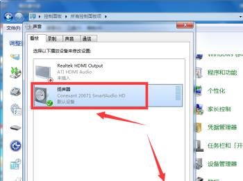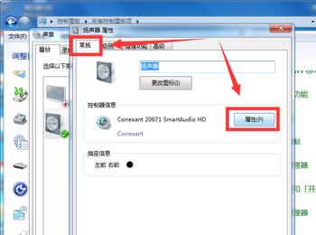 3. 第三步打开【声音】窗口后,根据下图箭头所指,选中【扬声器】并点击【属性】选项。