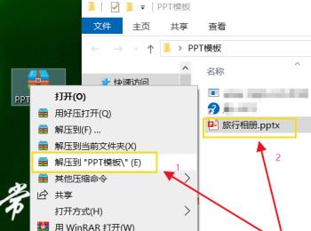 5. 将模板下载到桌面之后,在上面右键,在打开的菜单中,选择【解压到“PPT模板”】等待模板解压完成。