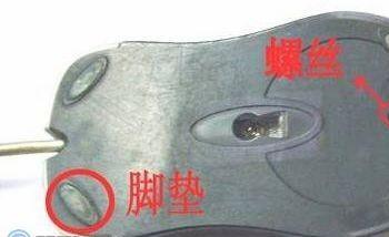 鼠标的紧固螺丝一般都在底面,除了图中的位置以外,还有设计在脚垫或者标签下的(图2)。注意拆开鼠标外壳的时候要先向上再向前用力,因为这种普及的鼠标在前部一般都会有两个卡扣。