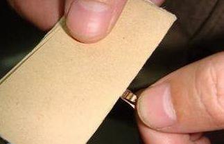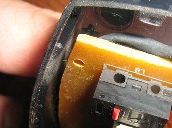 下面的就是最重要的步骤了,刚才说了鼠标能够正常点击是靠微动开关里面的触点接触实现的,而出现失灵就是因为触点出现了毛刺、锈蚀等情况,引起 接触不良。所以我们把触点打磨一下就可以了。打磨使用的材料是一张比较毛糙的硬纸片,有人会建议用细砂纸打磨,这种材料需要购买,二是细砂纸很容易将触点 磨花,这样可能用不了多久,触点又会被锈蚀。如图6和图7,我们要打磨弹簧片上的触点和留在微动开关上的触点。
