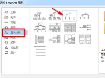 3. 第三步在弹出的【选择SmartArt图形】窗口,根据下图方框选择左侧菜单栏中的【层次结构】选项,在右侧窗口中点击箭头所指的图形,然后点击最下方的【确定】选项。