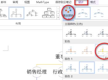 6. 最后还可以对所插入的组织结构图进行美化处理,比如可以更改整体的颜色,根据下图所示,点击菜单最上方的【设计】选项,在菜单栏中选择【更改颜色】,就可以在出现的窗口中选择自己想要的颜色进行修改。