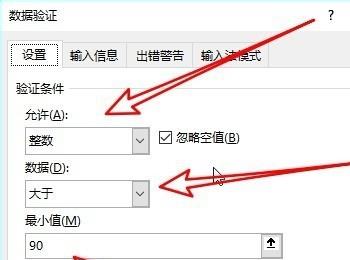 5.第五步,来到下图所示的数据验证页面后,将允许更改为整数,接着更改数据为大于,并更改最小值为90,接着点击页面底部的确定选项。