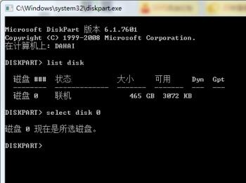 6. 第六步先在命令行中输入【select disk 0】并按下【回车】键,接着根据下图所示,成功选中磁盘0。