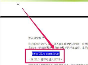 根据目录查找到BIOS设置这一章,查看进入BIOS的按键,一般都会显示为英文,如下图“Press DEL to enter Setup”,这句英文意思是“按DEL键确定进行BIOS设置”。