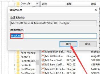 5.第五步,来到下图所示的编辑字符串页面后,更改msyh.ttc为想要的字体,接着点击页面底部箭头所指的确定选项。