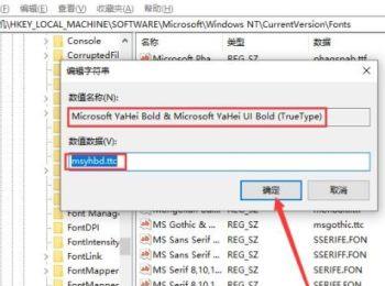 6.第六步,在下图所示的页面中,双击或者右击打开Microsoft YaHei Bold & Microsoft YaHei UI Bold(TrueType)文件,接着更改msyhbd.ttc为想要的字体,接着点击箭头所指的确定选项,然后重启电脑即可。