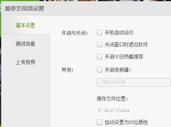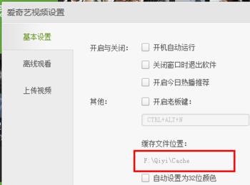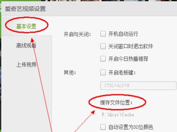 在爱奇艺视频设置窗口中,可以看到基本设置菜单下有一个 缓存文件位置选项。