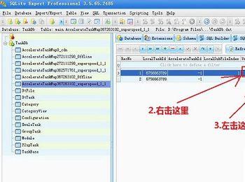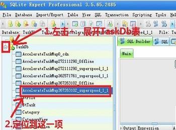 第六步: 在SQLite Expert Professional中展开TaskDb,然后找到左边SQL表中 AcclerateTaskMapxxxxsuperspeed 一项(若有多个,是按xxxx升序排列的,最下面的就是最近的)。