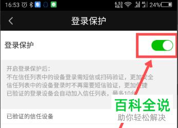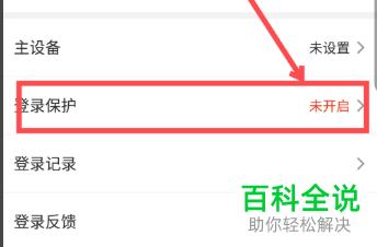 7. 第七步验证通过后,根据下图箭头所指,将【登录保护】选项后的圆圈向右滑动,启用该功能。