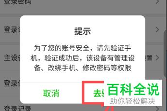 6. 第六步在弹出的【提示】窗口中,根据下图箭头所指,点击【去验证手机】选项。