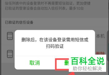 8. 第八步找到并点击想要删除的信任设备,在弹出的窗口中根据下图箭头所指,点击【删除】选项。