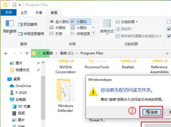 9. 完成后,双击windowsapps文件夹,在弹出的窗口中,点击【继续】,即可打开windowsapps文件夹了。