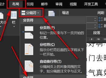 1. 首先打开电脑上想要编辑的word文档,进入编辑页面后,依次点击上方的布局—分隔符—下一页选项,如图。