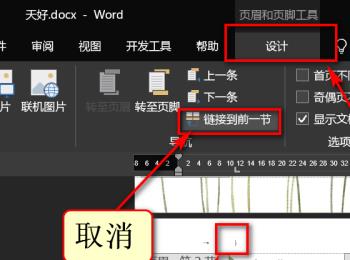 6. 接下来,定位到第2页的页眉位置,点击上方的设计菜单,然后选择链接到前一页点击,取消和第1页的链接。