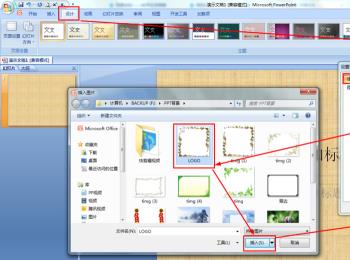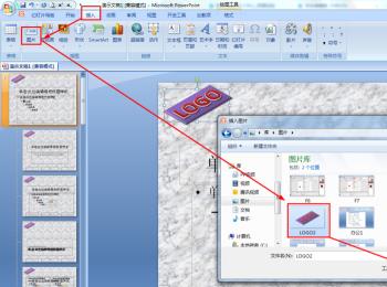3. 第二步进入母版页面后,根据下图箭头所指,依次点击【插入-图片】选项,在弹出的窗口中选择想要添加的logo,然后点击【插入】。