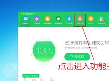 2. 进入360安全卫士的软件之后,我们在软件的顶端选项中找到功能大全图标,点击打开