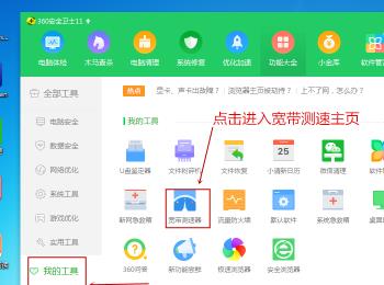 3.接下来我们会进入到360安全卫士的工具界面,我们在界面的左侧菜单中找到我的工具选项,点击之后在右侧就会出现我们所有的工具,接下来我们只需要在右侧窗口中找到宽带测速器的图标,点击打开