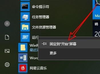 2. 在运行选项上右键,在打开的菜单中,选择“固定到开始屏幕”选项。