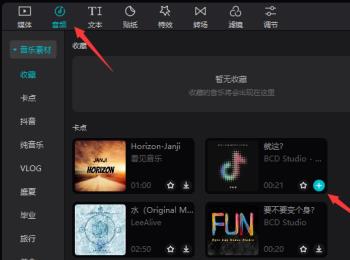 3. 第三步根据下图箭头所指,先点击【音频】图标,接着找到需要添加的音乐素材,然后根据下图箭头所指,点击【+】号图标并拖动到时间轴。