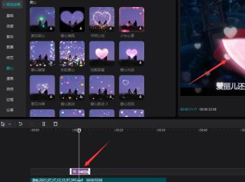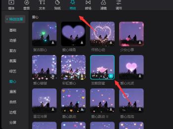 4. 第四步根据下图箭头所指,先点击【特效】图标,接着找到需要添加的音乐素材,然后根据下图箭头所指,点击【+】号图标并拖动到时间轴。